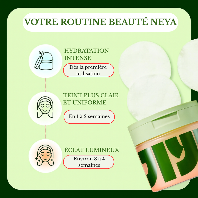 Nos pads double-texture innovants possèdent une face douce et matelassée pour une application délicate, et une face légèrement texturée pour une exfoliation efficace ciblant les ridules, le teint irrégulier, la pigmentation et les marques d’acné, en un seul geste.